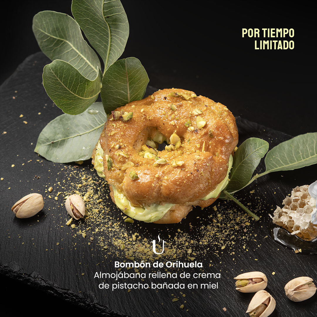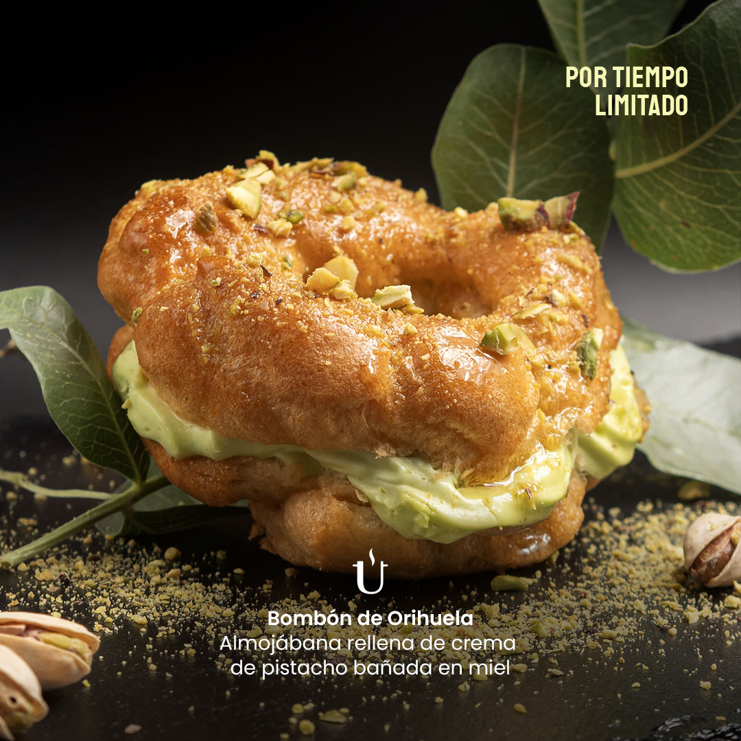 Bombón de Orihuela: Almojábana rellena de crema de pistacho bañada en miel natural